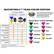 Our BucketBall™ Team Color Edition Party Pack includes all 3 types of game balls and our exclusive inflatable rack set. Our inflatable rack set allows you to play BucketBall anywhere without having to fill the buckets with water, sand, or some weighted object. They securely hold BucketBall buckets in place during game play and prevent them from knocking over. They even allow you to play BucketBall on water! It has a rapid inflate/deflate valve on the bottom so you can easily inflate the racks within seconds without the need for a pump. The bottom of the racks include 3 securing tabs that allow you to secure the racks to the ground with a garden stake (not included) or secure the racks with a rope and anchor (not included) when playing on water. Our Party Pack also includes our 3 game balls: Hybrid Balls, Bucket Pong Balls, and Tailgate Balls. Each provide different game play experiences and different levels of difficulty. The entire set weighs less than 11 pounds and fits into our convenient and easy to carry duffel bag (see pictures).